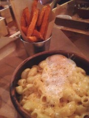 The Mac ‘n’ Cheese came with Butternut Squash, and Poached egg and I chose two sides of Sweet Potato Fries and Greens. The 2 sauces were BBQ and Homemade Spicy Sauce.