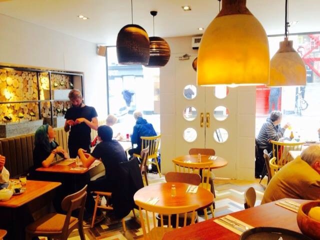 It’s buzzing basement space is set out like a canteen with the menu on a board behind the counter and huge salad table. You can also order hot food, and baked goods, wine and local craft beer.
