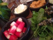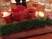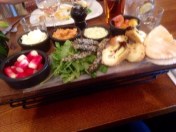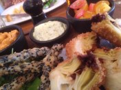 The Veggie Board consisted of stuffed artichoke hearts, and pesto Mayo, Heritage Tomatoes, salad, goats curd, spicy Hummous, and radishes with toasted pitta, and seeded straws.