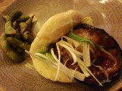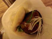 The food was informally presented, but constituted three different dishes. The first Vegetarian dish was the Aubergine and Miso Bao.