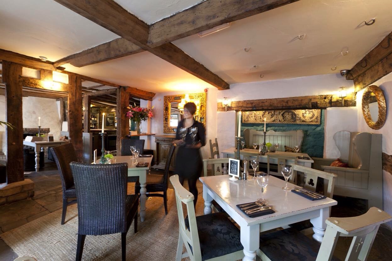 The dining room is sumptuously lit which gives a romantic delight to the meal. Dark wood and contemporary wallpaper make it feel grand but relaxed.