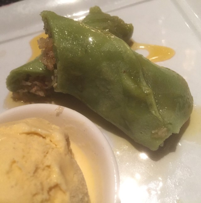 The distinctive green colour of the Pandan leaf makes  a vibrant pancake into a satisfying end to the meal. It offers a wonderful subtle flavour to the gentle coconut. Traditionally a breakfast sweet originating from Bali it proves to make a fantastic dessert and well recommended to quench the spicyness of the previous courses. A winner.