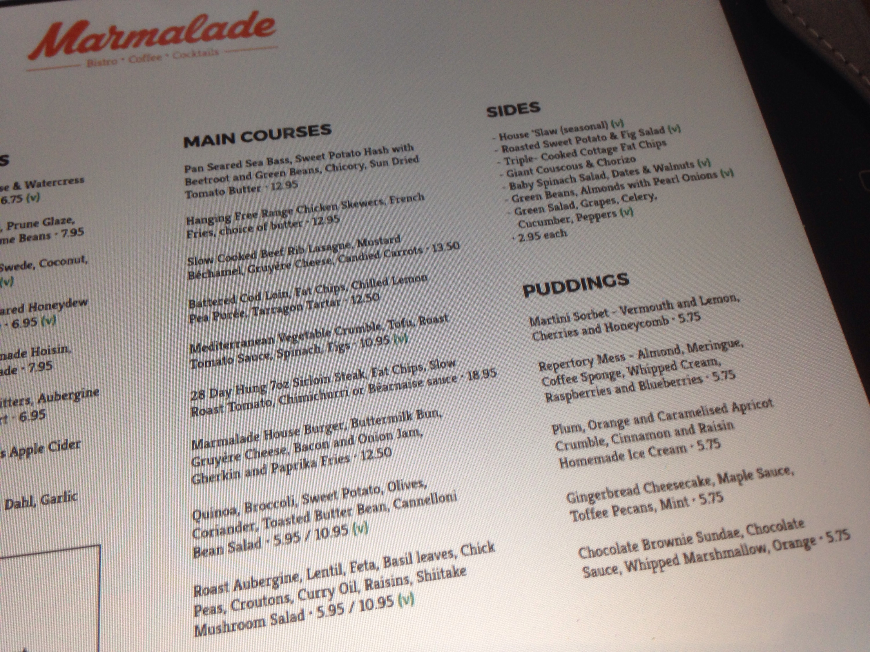 I think the menu shows innovation and real thought for vegetarian diners, and many high end restaurants and bistros could take a leaf out of Marmalade’s book. Credit is therefore given to Bitters ‘n’ Twisted. Thank you.