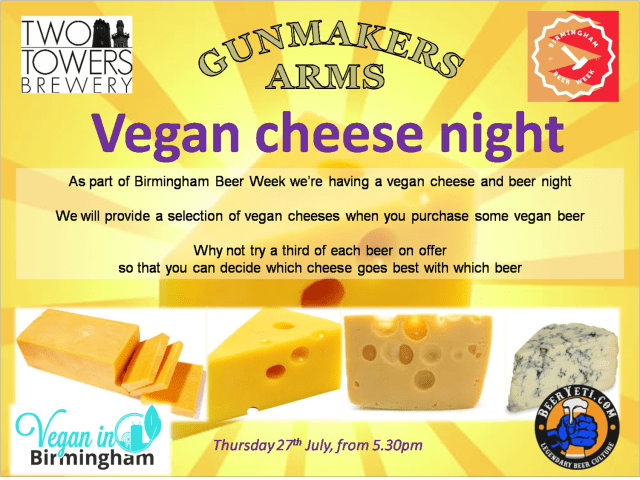 The Gunmakers Arms are holding a Vegan cheese night on Thursday 27th July from 7.30pm.