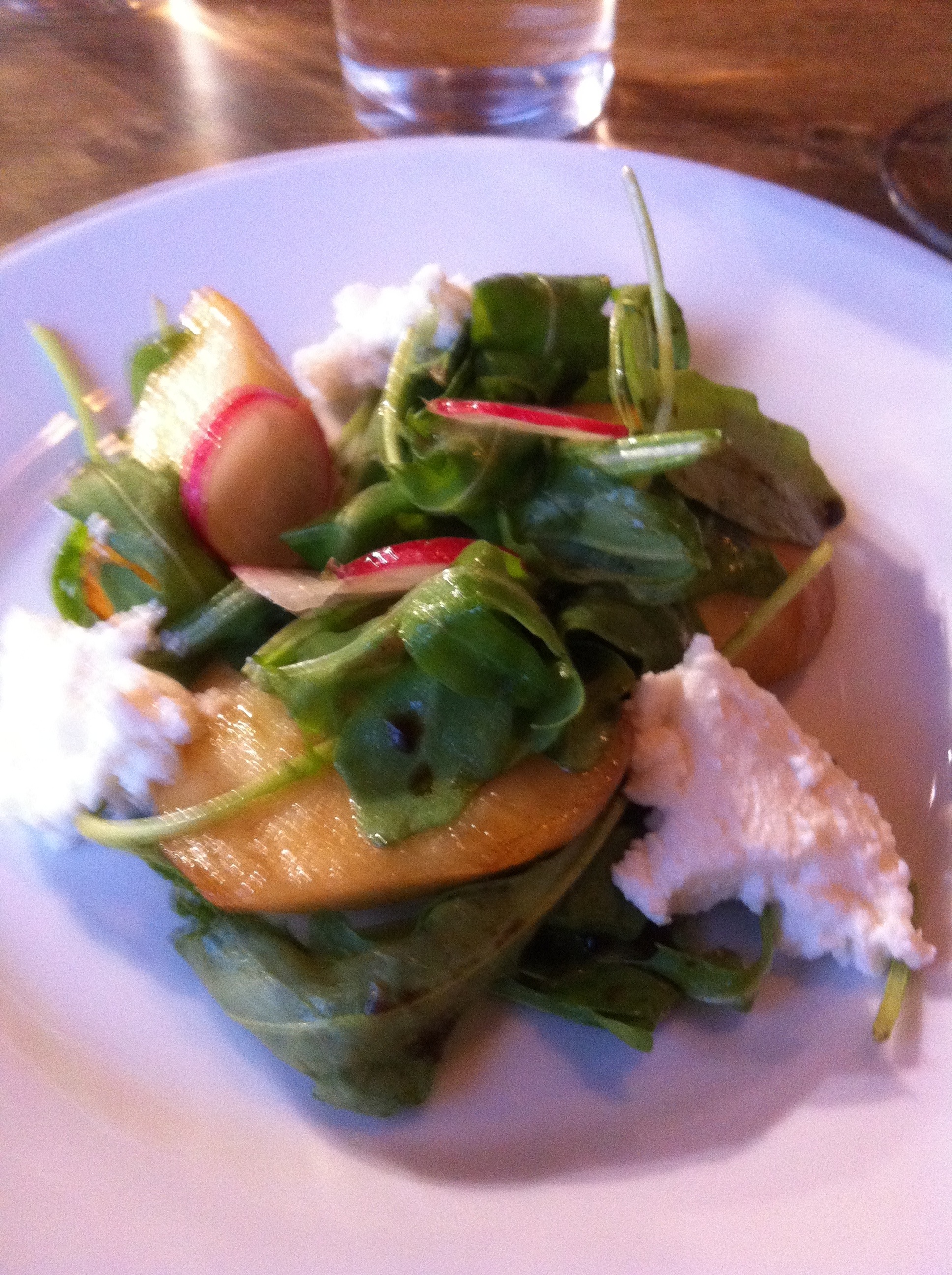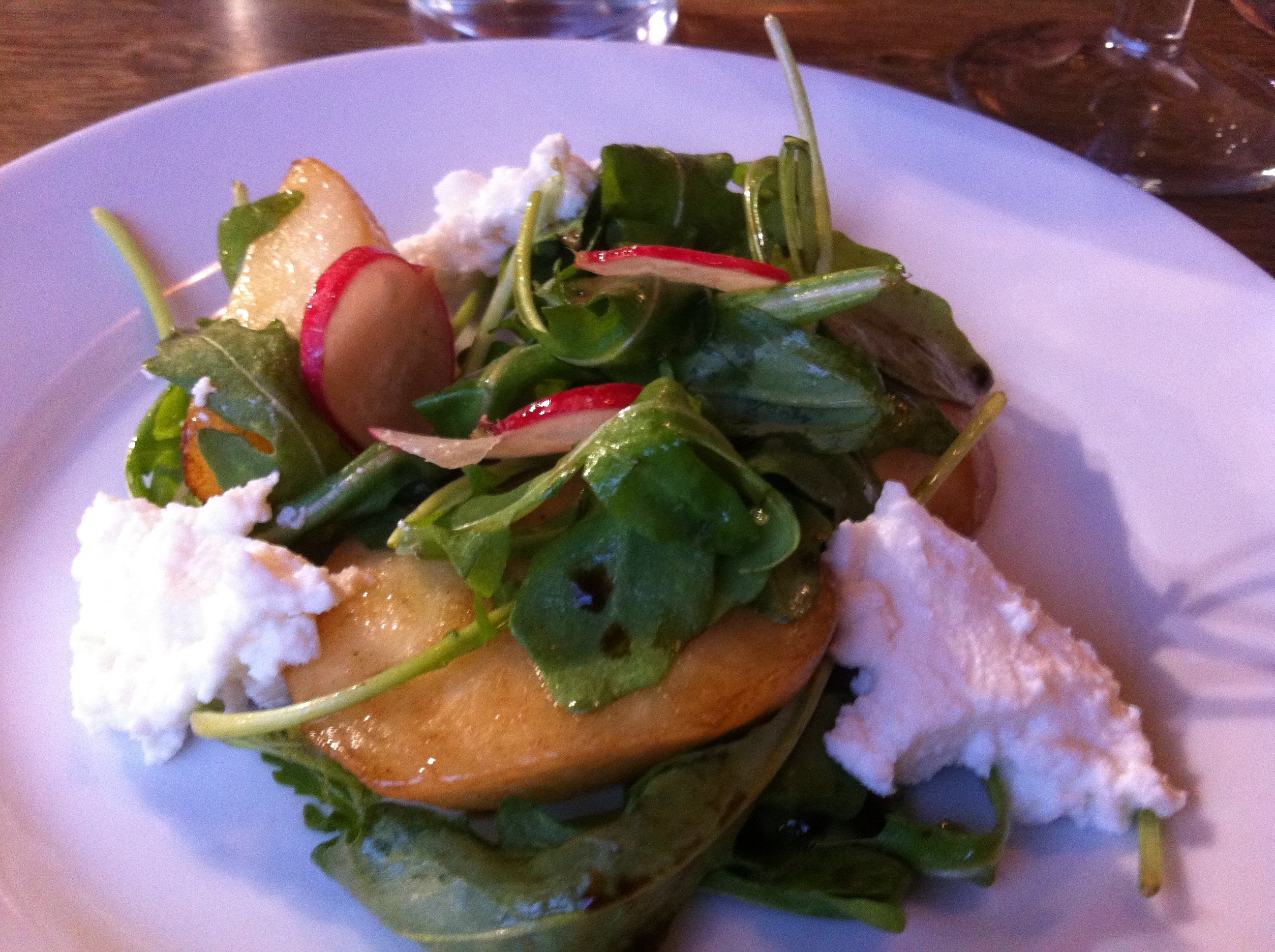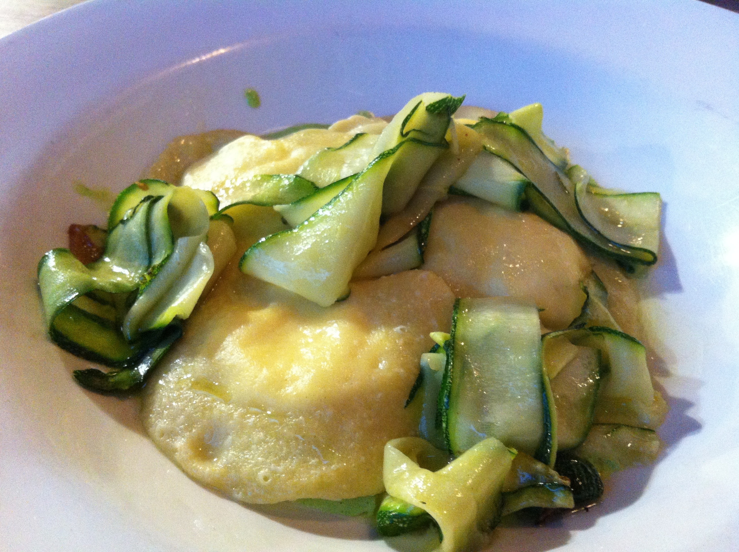 Goats cheese ravioli, broad beans, courgettes. The dish was lovely. The quality of the ingredients shone through, the goats cheese ravioli, hand made, with a delicate flavour that with the summery broad beans and courgettes made a stunning fine dining like dish. A real delight.