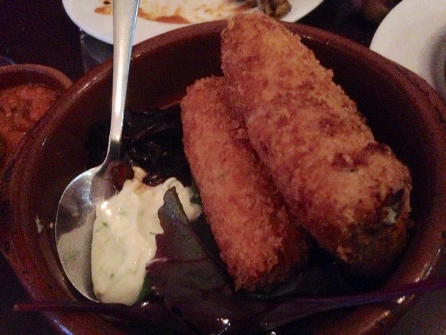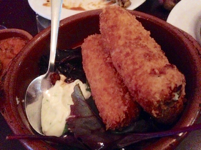 Croquetas: Cheese and spinach croquetas served with alioi and red onion jam.