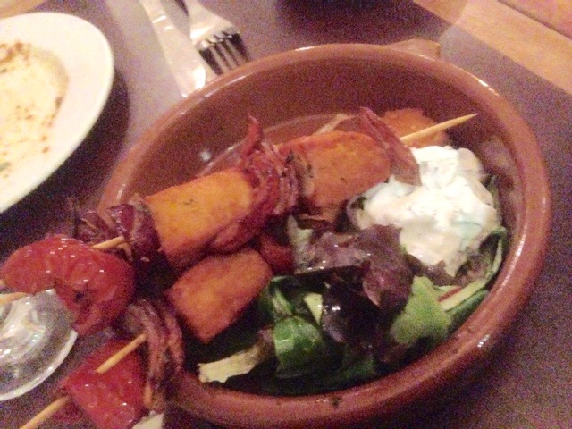 The star dish on the night. Who doesn’t like skewers of Halloumi? Served with Mediterranean vegetables, the peppers in particular offer a juicy accompany ment as does the side salad and the garlicky Tzatiki. Halloumi heaven on a plate.