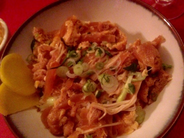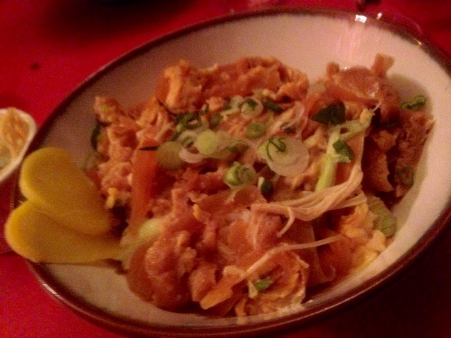 The dish was a portion of boiled rice topped with deep fried bean curd and scrambled egg sauce with onion sprinkle, finely sliced spring onion and served with Takuan and spaghetti salad.