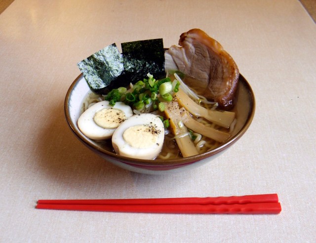 Home made medium thick noodles served in a complex vegetable soup, topped with seasoned boiled egg, bamboo shoots, beansprouts, spring onion, kikurage mushrooms, fried veggies with sesame oil and seaweed.