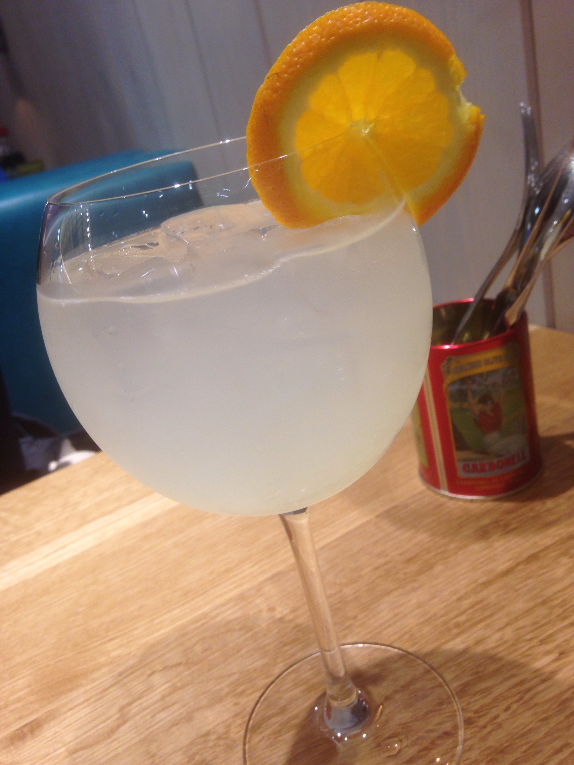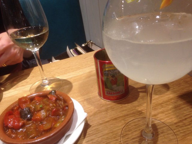 We began with drinks. I ordered the Spanish gin based “Pomada” Xoriguer Gin and Fever Tree Lemonade. A refreshing gin tonic from Menorca with grapefruit and lime. Very nice, though quite sweet. Ruth ordered a glass of white wine (Vino Blanco).
