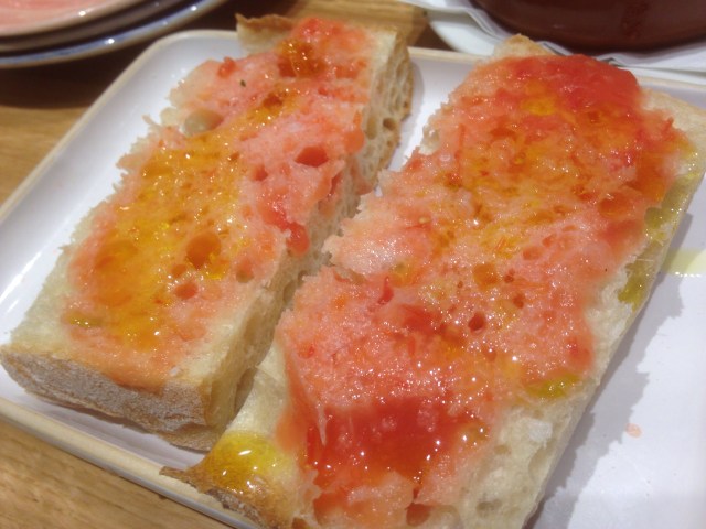 So ordered Almendras de Mallorca: (slow roasted almonds) and the beautiful Pan Con Tomate (toasted bread, garlic, tomato and olive oil) which was deliciously tomatoey and with a good but balanced garlic flavour. Lovely.