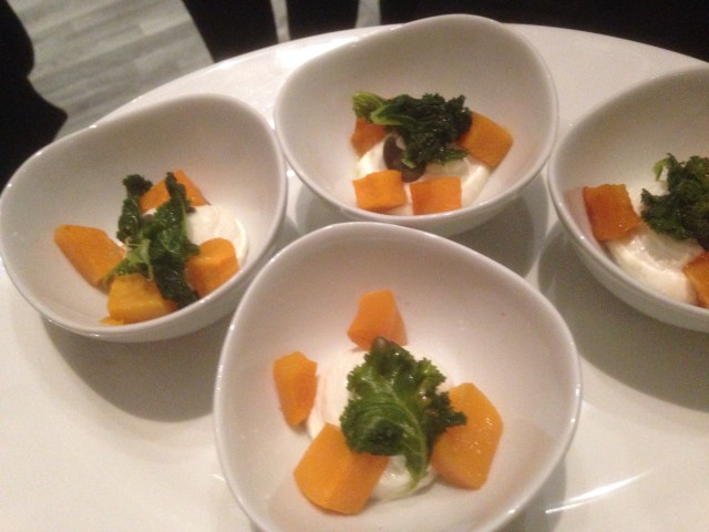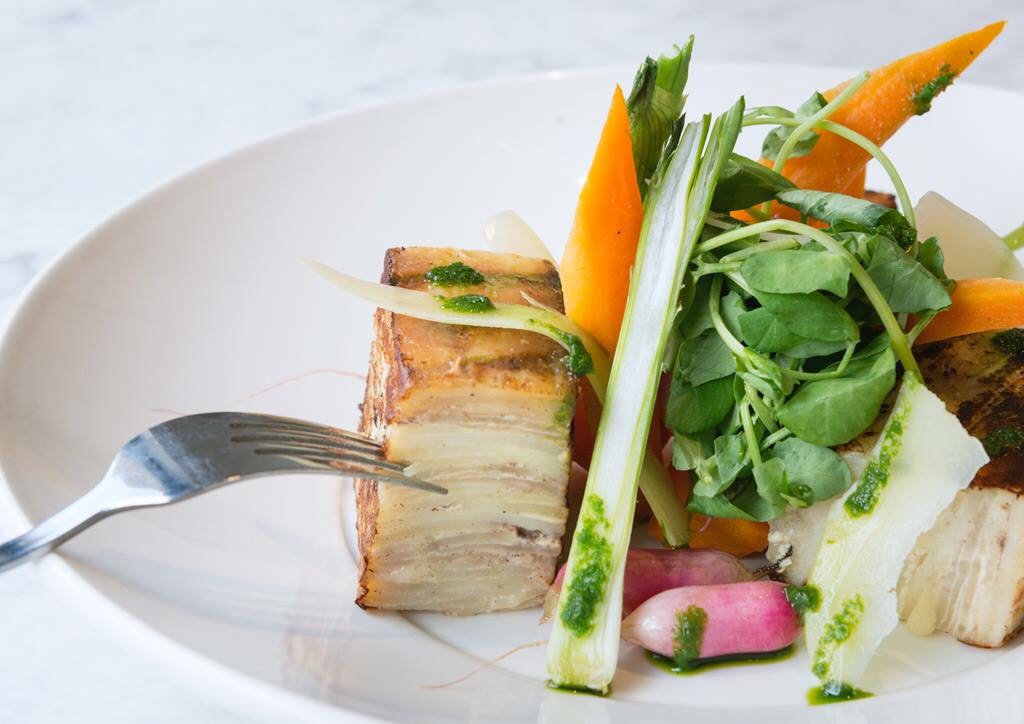 Wild herb sauce, wild sea cabbage, Brussel sprout, potato crackling and ‘parmesan’ dumpling: (1st photo)
