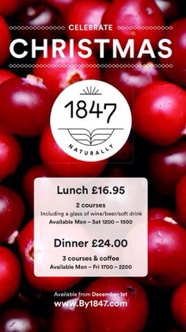 For a different Christmas type experience with good veggie and vegan dishes Bistro 1847 is a restaurant worth checking out.