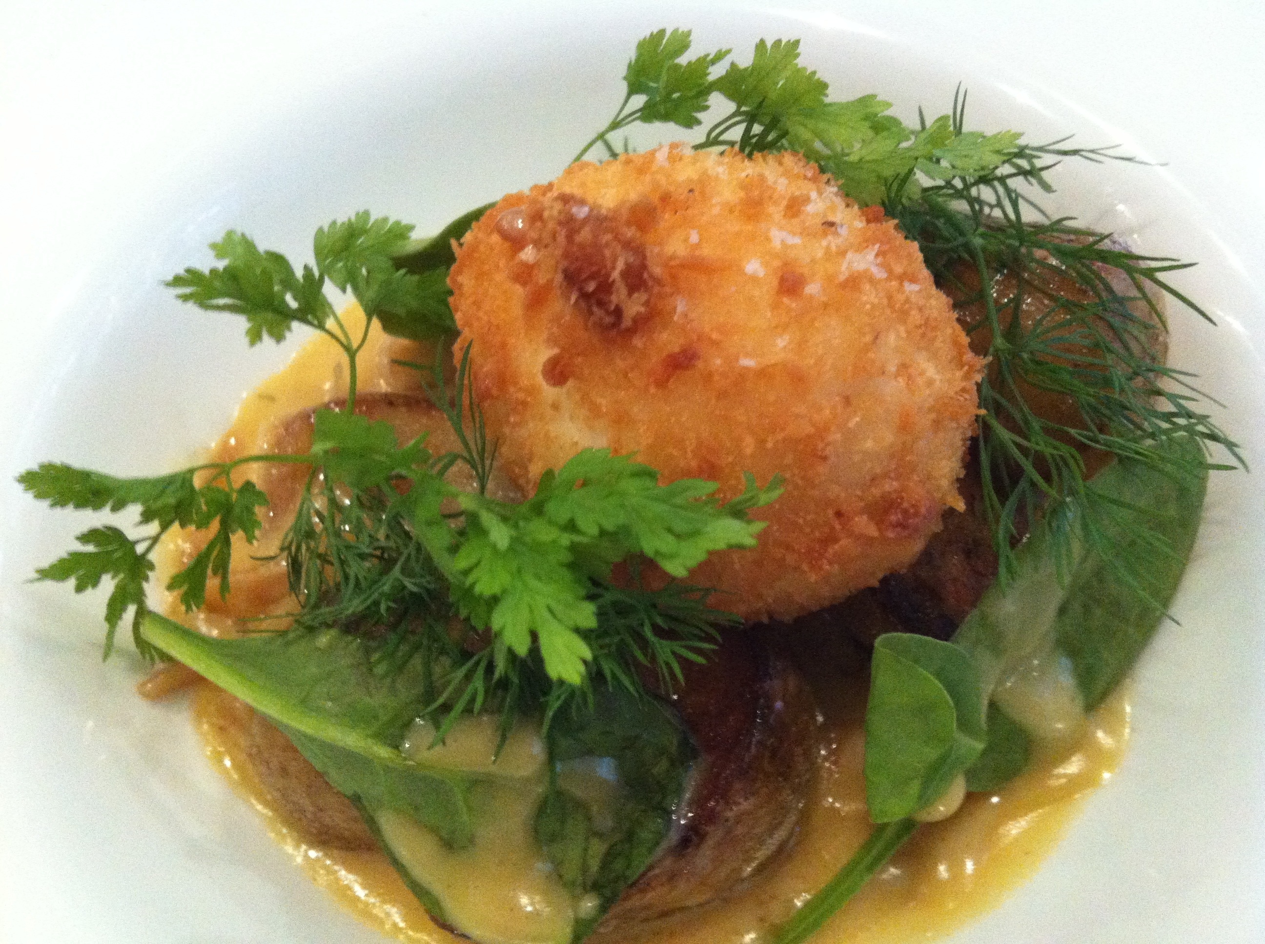 the Hen’s Egg. A Panko soft boiled hens egg, whiskey beurre blanc, curly kale, crisp potato, shallots, bourbon smoke. I can only describe it as a visual and taste sensation.